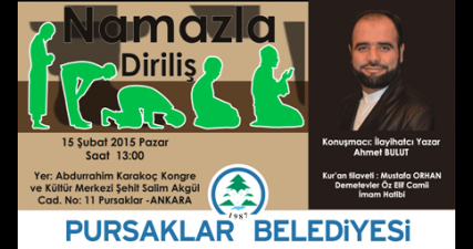 Pursaklar Belediyesi tarafından düzenlenecek olan program, İlahiyatçı yazar Ahmet Bulut 'Namazla Diriliş' konferansı 15 Şubat 2015 pazar günü yapılacak.